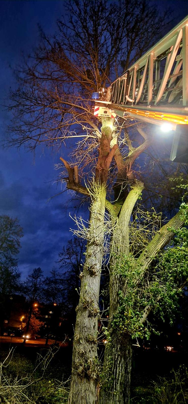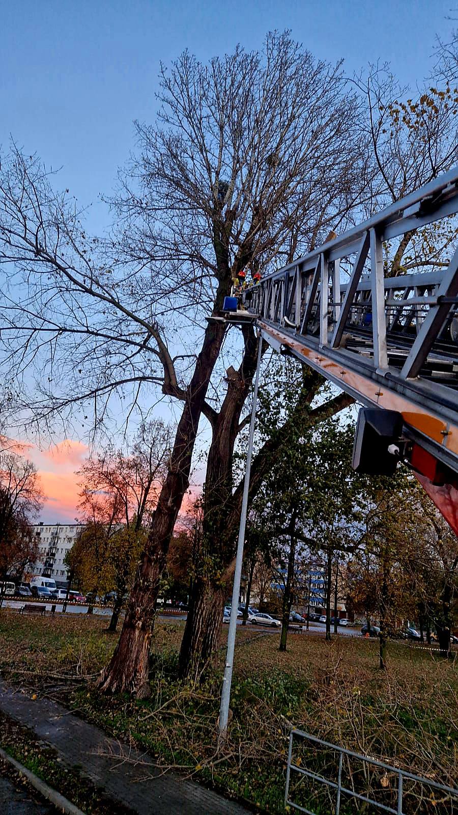 Na miejscu pracowali strażacy z JRG Łowicz oraz OSP Łowicz, którzy przy użyciu samochodu z drabiną mechaniczną przystąpili do usuwania niebezpiecznego drzewa. Wraz z pogarszającą się pogodą akcję na wysokości przerwano, a teren został zabezpieczony i odgrodzony taśmą ostrzegawczą.