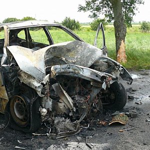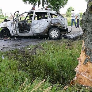 3 Spalony Ford Focus i drzewo, w które uderzył po zjechaniu z jezdni. fot. tb Spalony Ford Focus i drzewo, w które uderzył po zjechaniu z jezdni. fot. tb