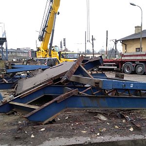 Część kładki - ta bliżej budynku dworca - już została rozebrana. Pozostały po niej betonowe podpory konstrukcji. Metalowa konstrukcja jest składowana w kilku miejscach.