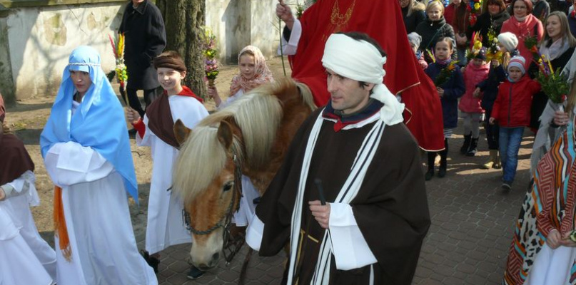 Zanim rozpoczęła się Eucharystia, większość wiernych stanęła wokół krzyża misyjnego, który znajduje się przy świątyni. Tam proboszcz Władysław Moczarski odczytał fragment Ewangelii i poświęcił przyniesione palmy. Potem w asyście dzieci z parafialnej scholi oraz ministrantów przebranych w stroje nawiązujące do czasów, gdy żył Jezus Chrystus, siedząc na koniu został odprowadzony procesyjnie do głównych drzwi świątyni. Było to nawiązanie do przekazów ewangelistów, którzy opisują wjazd Jezusa do Jerozolimy na osiołku.