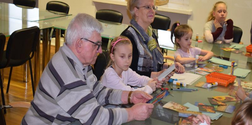 Dzieci, młodzież, z rodzicami albo dziadkami, biorą udział w zorganizowanych jak co roku przez Muzeum w Łowiczu warsztatach z okazji zbliżających się Dni Babci i Dziadka.