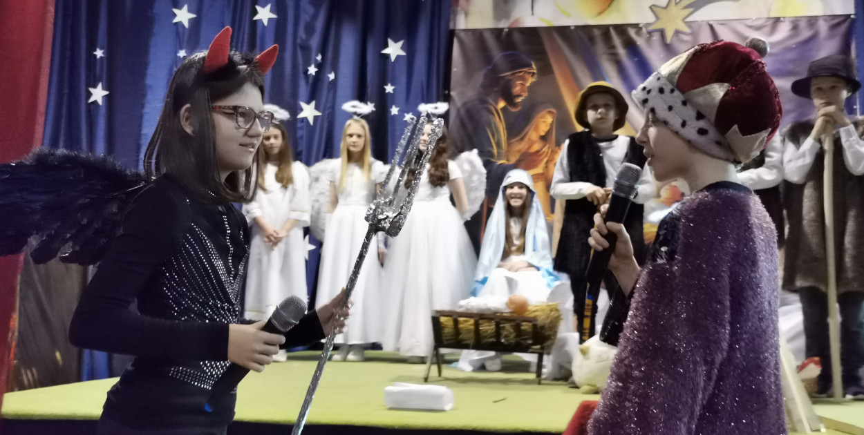 Przedstawienie o przyjściu na świat oczekiwanego Zbawiciela uczniowie wystawili w specjalnie przygotowanych strojach oraz w otoczeniu pięknej scenografii. Dopełnieniem świątecznej atmosfery były zaśpiewane kolędy.