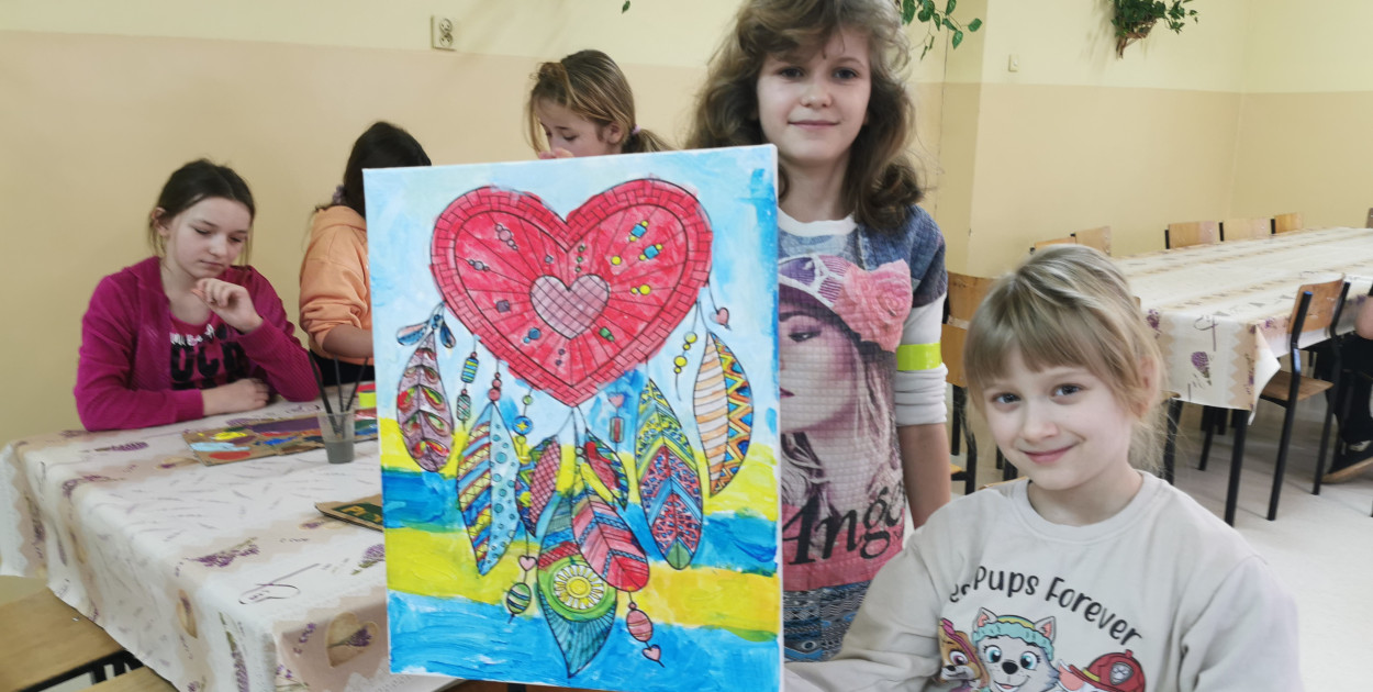 Wojciech Kutkowski powiedział nam, że dzisiejsze zajęcia polegają na swobodnym malowaniu farbami akrylowymi na podkładkach z płótnem, co jest dla uczestników pewnego rodzaju nowością. Dzieci sięgnęły po różnorodną tematykę, są to m.in. gry, krajobrazy czy podwodny świat. Po zakończonym malowaniu prace uczestników zostały ustawione na parapecie do wyschnięcia. Maja i Hania, uczennice SP nr 4 w Łowiczu malowały wspólnie, i jak nam powiedziały, ich praca przedstawia niezwykły świat. Dziewczynki stwierdziły, że dobrze się bawią, a udział w zajęciach jest zdecydowanie lepszy niż nudzenie się w domu.
