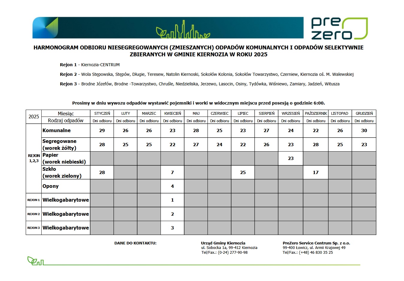 Urząd Gminy Kiernozia oraz firma PreZero Service Centrum przypominają o terminach odbioru odpadów obowiązujący w listopadzie i grudniu 2025 roku. Zgodnie z planem mieszkańcy powinni pamiętać o wystawieniu pojemników i worków z odpadami przed posesję do godziny 6.00 rano w dniu odbioru.