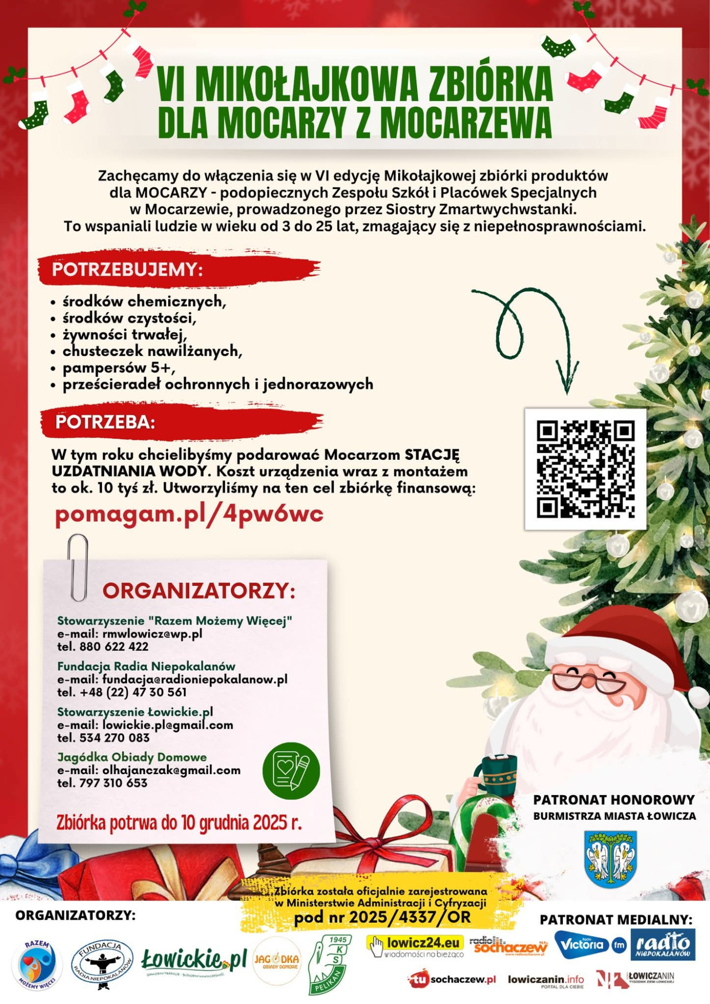 To już szósta edycja świątecznej akcji, która ma swoje serce w Łowiczu. Z inicjatywy Pawła Kreta i Stowarzyszenia Razem Możemy Więcej ruszyła Mikołajkowa Zbiórka dla Mocarzy z Mocarzewa – dzieci i młodych dorosłych z niepełnosprawnościami. W tym roku pomoc ma wyjątkowy cel: zapewnić im czystą, zdrową wodę na co dzień.