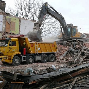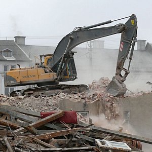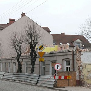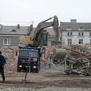W poniedziałek 13 marca, od strony ul. Podrzecznej, widoczny jest parter budynku. Z tyłu, od ulicy Starorzecze, widać już tylko dużą hałdę krokwi, desek i cegieł, po której porusza się koparka, która burzy ściany i wywozi gruz poza obręb budynku.