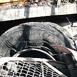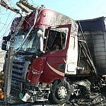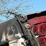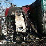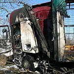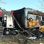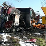 Do groźne wyglądającej kolizji doszło dziś, w poniedziałek 27 marca, krótko po godz. 6. Na wysokości Jackowic jadący w kierunku Zdun od Łaźnik ciągnik siodłowy z naczepą uderzył w słup energetyczny. W wyniku tego wybuchł pożar, który strawił kabinę i część naczepy, w której w klatkach przewożone były kurczaki.