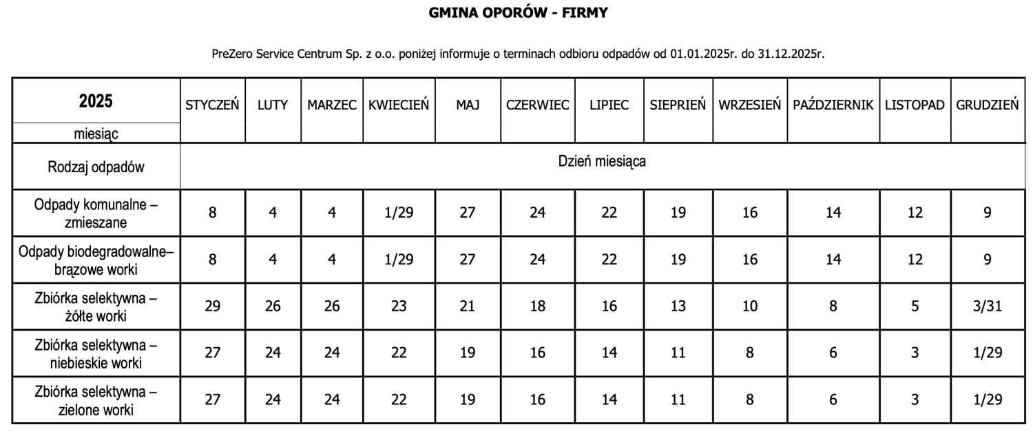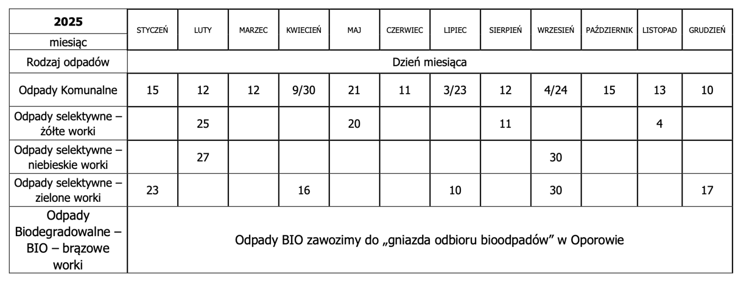 Harmonogram odbioru odpadów komunalnych niesegregowanych (zmieszanych) oraz odpadów zbieranych selektywnie w okresie od października do grudnia 2025 roku dla gminy Oporów.