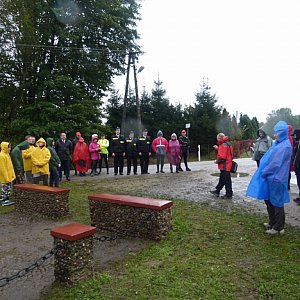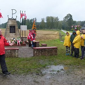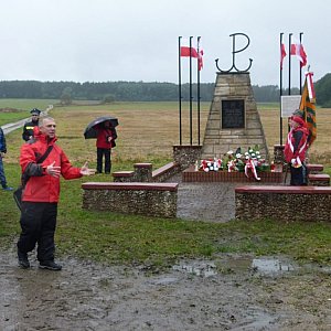 Przed południem byliśmy w Czatolinie, gdzie w miejscu zrzutu Jana Piwnika "Ponurego" znajduje się pomnik upamiętniający to wydarzenie. O zrzutach Cichociemnych opowiadał w siąpiącym deszczu Adam Szymański z PTTK, który prowadził dziś grupę pieszą.