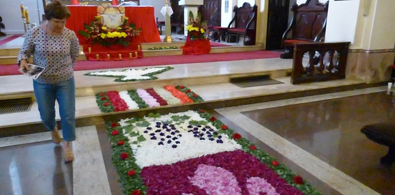Praca nad kobiercem, który od kilku lat jest układany w kościele parafialnym pw. Świętego Barłomieja, trwała od rana. Do południa przywożone i sortowane były kwiaty, około godz.12 panie rozpoczęły pracę. Jak nam powiedziała Wanda Szymczak, prowadząca wspólnotę, motyw narysowały kredą na posadzce, potem bardzo precyzyjnie sypały płatki kwiatków.