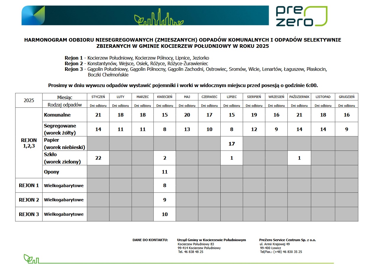 Worki można bezpłatnie odbierać u kierowców podczas wywozu, w siedzibie firmy PreZero lub w Urzędzie Gminy.Czarne worki przeznaczone na odpady komunalne wydawane są wyłącznie w Urzędzie Gminy w Kocierzewie Południowym.