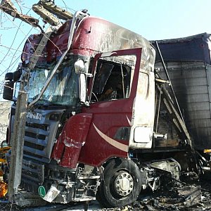 Do groźne wyglądającej kolizji doszło dziś, w poniedziałek 27 marca, krótko po godz. 6. Na wysokości Jackowic jadący w kierunku Zdun od Łaźnik ciągnik siodłowy z naczepą uderzył w słup energetyczny. W wyniku tego wybuchł pożar, który strawił kabinę i część naczepy, w której w klatkach przewożone były kurczaki.