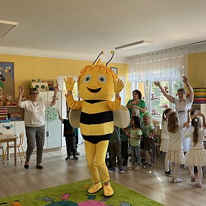 Na obchody tego wyjątkowego dnia dotarła także Pszczółki Maja, która wzbudziła niesamowitą radość na twarzach wszystkich dzieci. Po tańcu z Pszczółką Mają, rozpoczęły się zabawy i konkurencje. Przedszkolaki przechodziły przea tunel, mierzyły się z rozróżnieniem i odpowiednim podziałem warzyw i owoców, podnosiły kuleczki spinaczami, a na koniec starszaki mogły pochwalić się wiedzą o przedszkolu podczas qiuzu.Dzieci wzięły udział także w konkurencji, w której mogły wykazać się umiejętnością ubierania zimowych strojów!