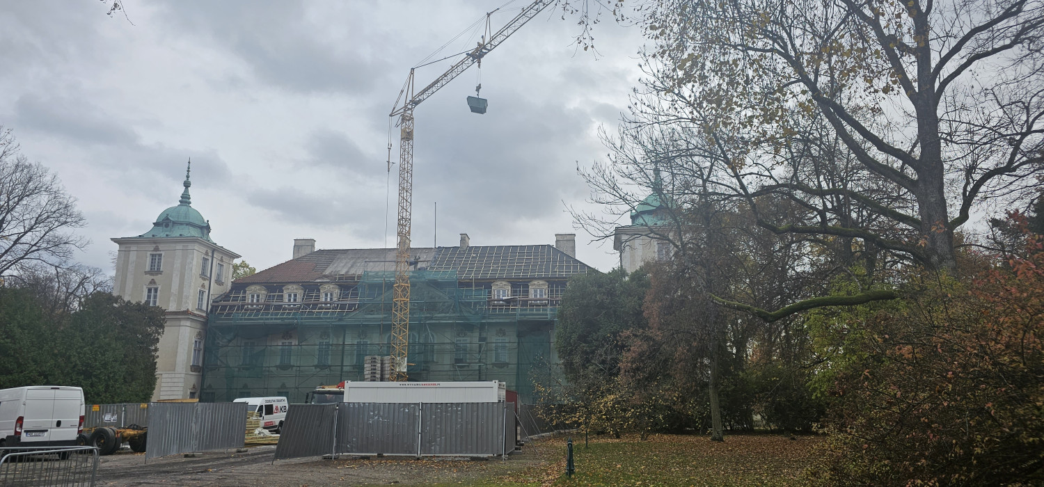 Ze względów logistycznych i dla zachowania spokoju w otoczeniu pałacowego parku, roboty prowadzone są od północnej strony budynku. Ekipy remontowe korzystają z dźwigu, który umożliwia bezpieczne dostarczanie materiałów na dach, bez ingerencji w przestrzeń od strony południowej.