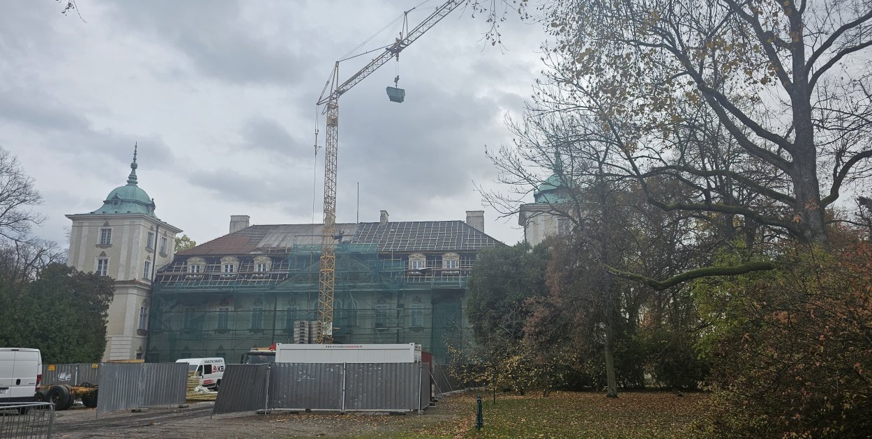 Ze względów logistycznych i dla zachowania spokoju w otoczeniu pałacowego parku, roboty prowadzone są od północnej strony budynku. Ekipy remontowe korzystają z dźwigu, który umożliwia bezpieczne dostarczanie materiałów na dach, bez ingerencji w przestrzeń od strony południowej.