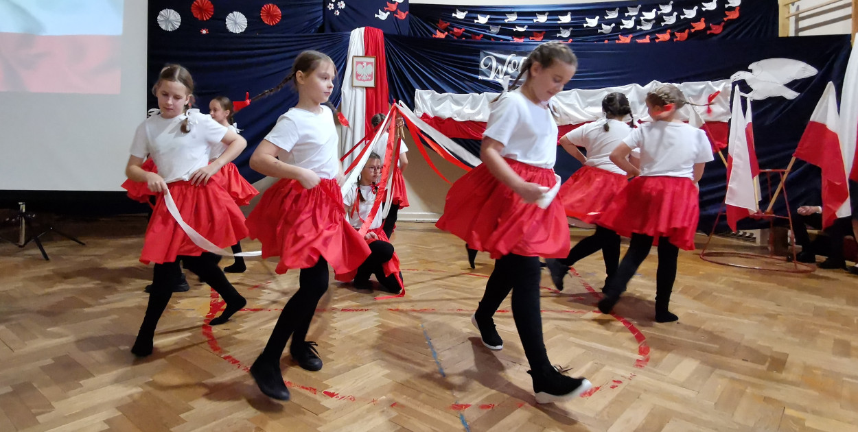 W dalszej części akademii uczniowie wysłuchali pieśni „Szara piechota”, a całość zwieńczył efektowny taniec z biało-czerwonymi szarfami w wykonaniu uczennic szkoły.