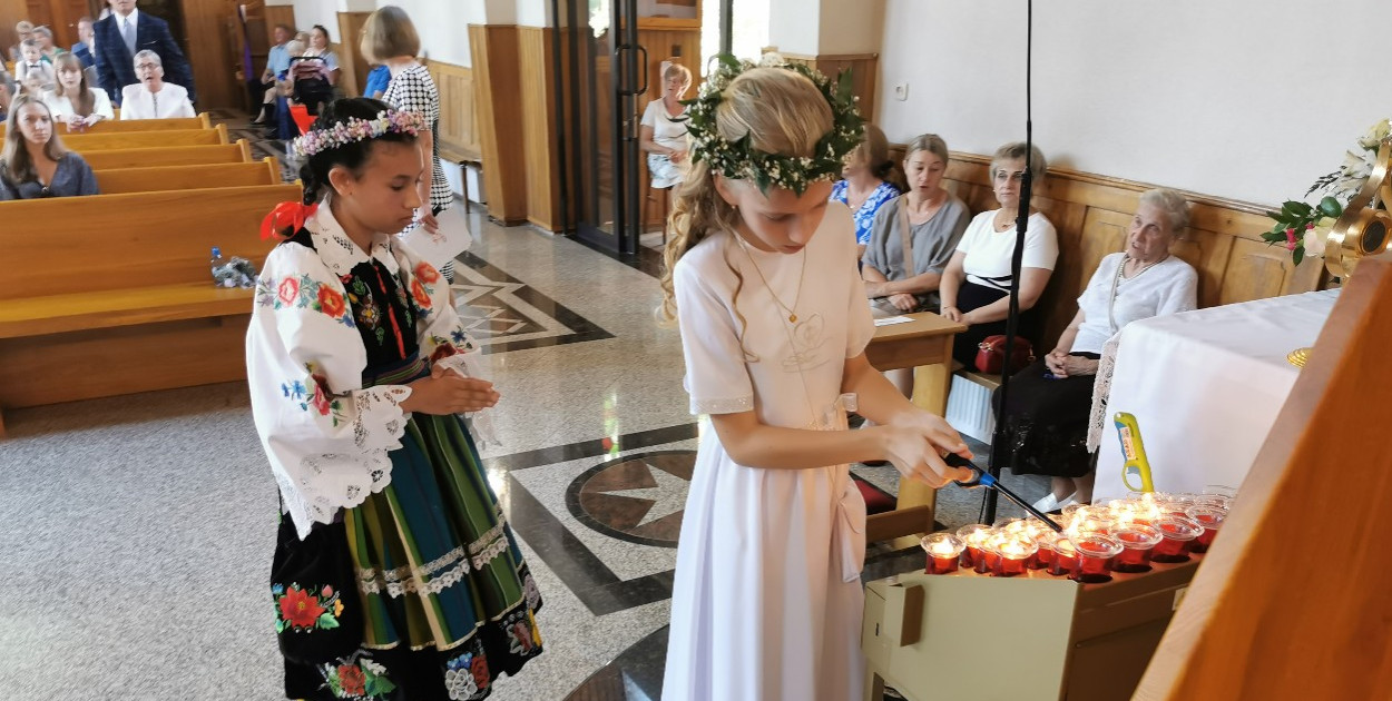 Wielkie święto, jakim jest przyjęcie po raz pierwszy w życiu sakramentu Eucharystii, przypadło dziś akurat w dniu, w którym tradycyjnie obchodzi się Dzień Matki. Z tej okazji dzieci zostały poproszone przez ks. proboszcza Sylwestra Łajszczaka o wejście do kościoła na krótko przez rozpoczęciem Mszy św. i zapalenie, każde po jednej świecy w intencji swej mamy. Dziewczynki podchodziły kolejno i zapalały świece w lichtarzu po lewej stronie ołtarza, chłopcy po prawej. Gest ma symbolizować i być zachętą do pamięci o matce w modlitwie.